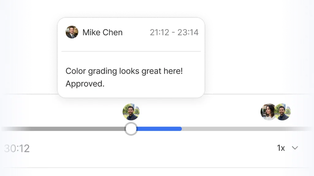 Click anywhere on the timeline to drop a comment at the exact frame that needs fixing. Single point or time range — your choice.